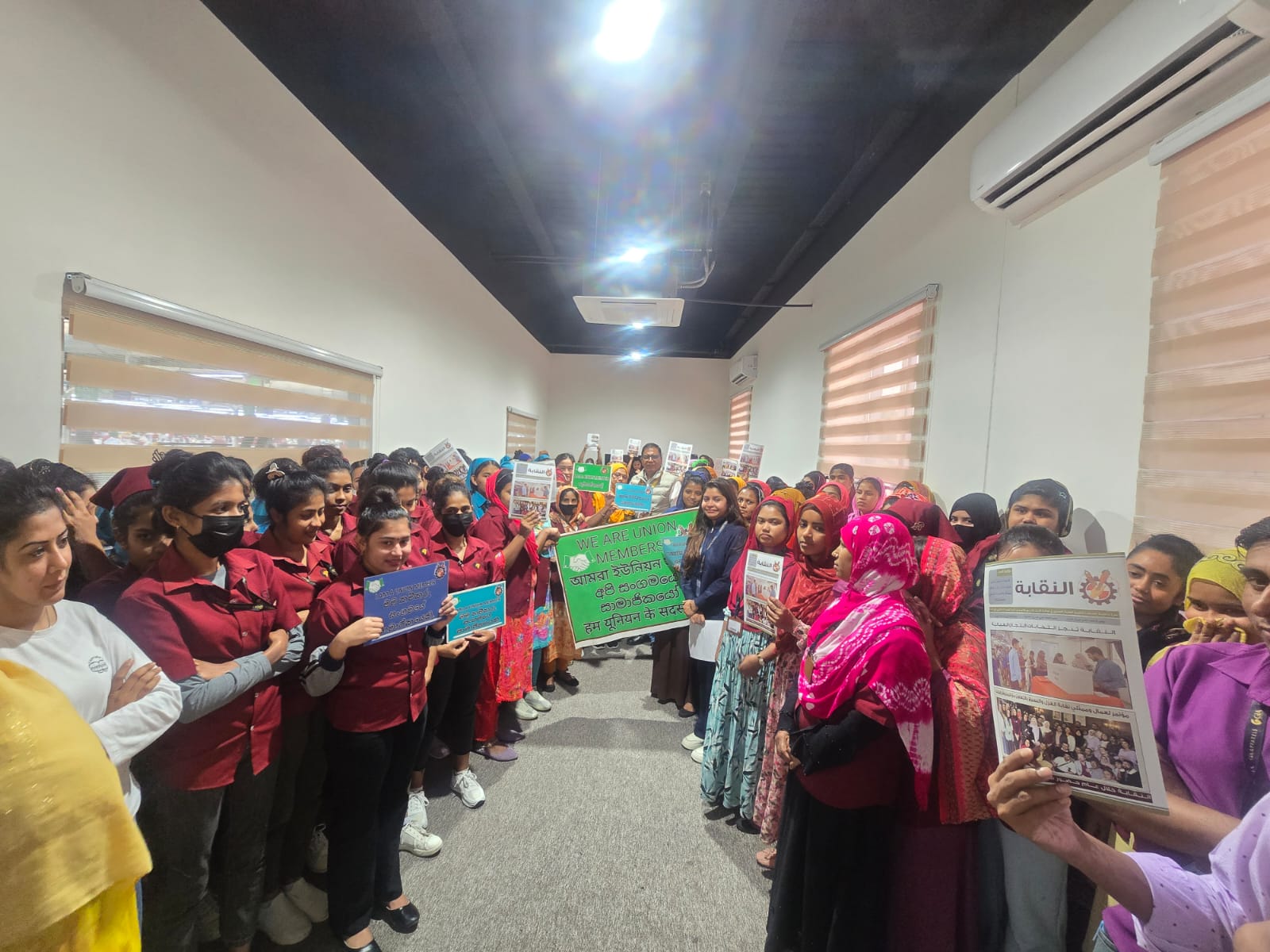 وعقدت ممثلة النقابة في التجمعات الصناعية الزميلة إيمان نصر الله اجتماعاً في مصنع الصافي، بمشاركة 85 عاملة من الجنسيات البنغالية والسريلانكية والنيبالية، جرى خلاله التعريف بدور النقابة وإنجازاتها، وقيمة الاشتراك (نصف دينار)، وامتيازات بطاقة العضوية، بما في ذلك خصومات 30% لدى مختبرات مدلاب، و50% لدى العيادة العالمية، و10% لدى بعض الصيدليات، وتم توزيع مجلة النقابة.
