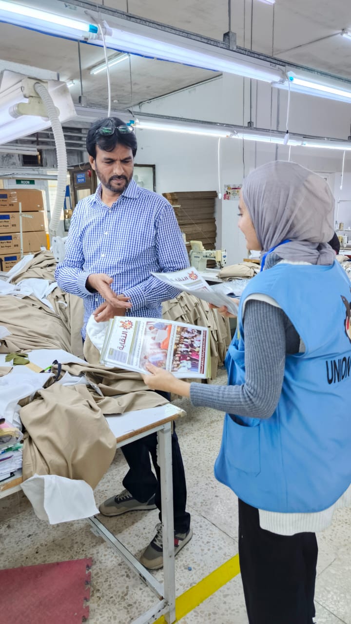 وفي محافظة العقبة اختتم المنسق النقابي أرشد خان والزميلة أميرة جولة ميدانية في منطقة العقبة استمرت ثلاثة أيام، شملت شركة GIA 3 (الورديتين الصباحية والمسائية)، حيث عقد اجتماع موسع مع 2700 عامل وعاملة من الجنسيات البنغالية والنيبالية والهندية والسريلانكية ومن ميانمار، جرى خلاله استعراض إنجازات النقابة، والاشتراكات، والاتفاقية الجماعية، والعقد الموحد، وآليات التواصل عبر الموقع الإلكتروني ومنصات التواصل الاجتماعي. كما تم تنسيب 1200 عامل وعاملة من الجدد (منذ 5/2025 وحتى 12/2025)، كما عُقد اجتماع في شركة GIA 2 بالعقبة مع 800 عاملة جديدات من الجنسيتين البنغالية والنيبالية، وتم تنسيبهن جميعاً لعضوية النقابة، وشملت الجولة زيارات إلى شركات ARK وElegant وFriends وKanzen وSidney وGIA 2 و3، بمشاركة الزميلة رغد، حيث جرى لقاء العمال والإدارات وتعريفهم بدور النقابة وممثليها.