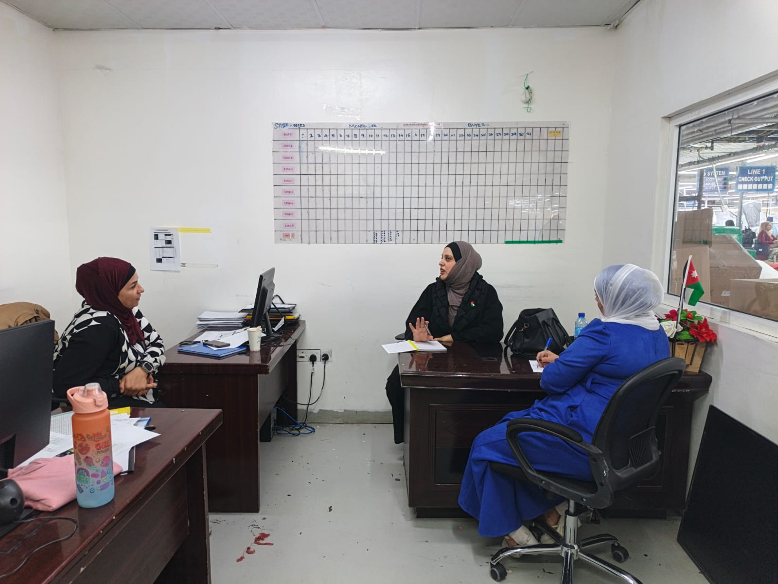 وفي محافظة الكرك، نفذت ممثلة النقابة، الزميلة دينا أبو قديري، زيارة إلى مصنع كلاسيك مؤاب، حيث عقدت اجتماعًا مع مسؤولتَي الموارد البشرية للعمال المحليين والوافدين، إلى جانب جولة ميدانية للتواصل مع العمال والعاملات.