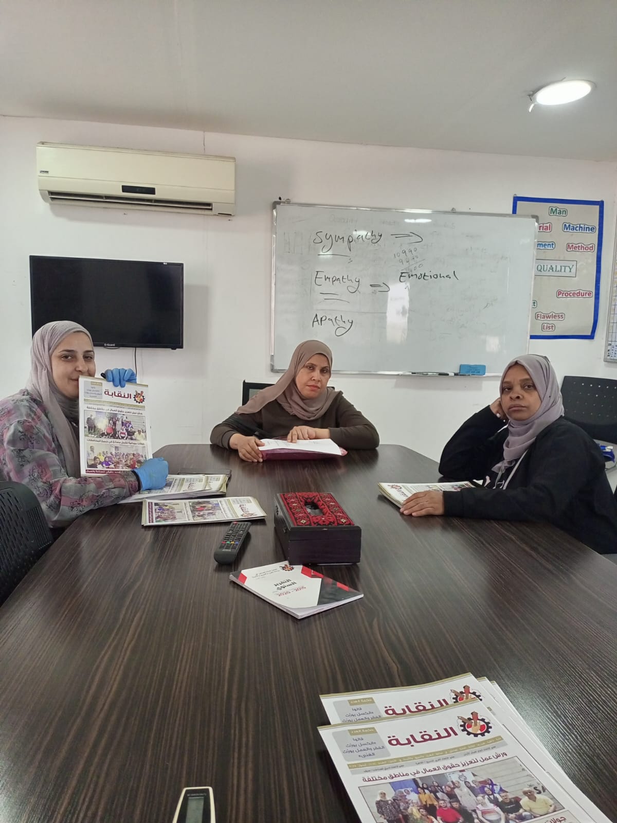 اما ممثلتا النقابة في محافظة اربد الزميلتان أحلام الطيراوي وروان الغزاوي، ممثلتَي النقابة في إربد، فقد زارتا شركة المسيرة حيث تمت مناقشة إجراءات طباعة بطاقات العضوية للعمال مع الإدارة، وعقد اجتماع مع اللجنة العمالية، تخلله استعراض ظروف العمل وتدوين ملاحظات العمال من أجل متابعتها والعمل على حلها، وتوضيح الامتيازات التي يحصل عليها العمال الأعضاء في النقابة.