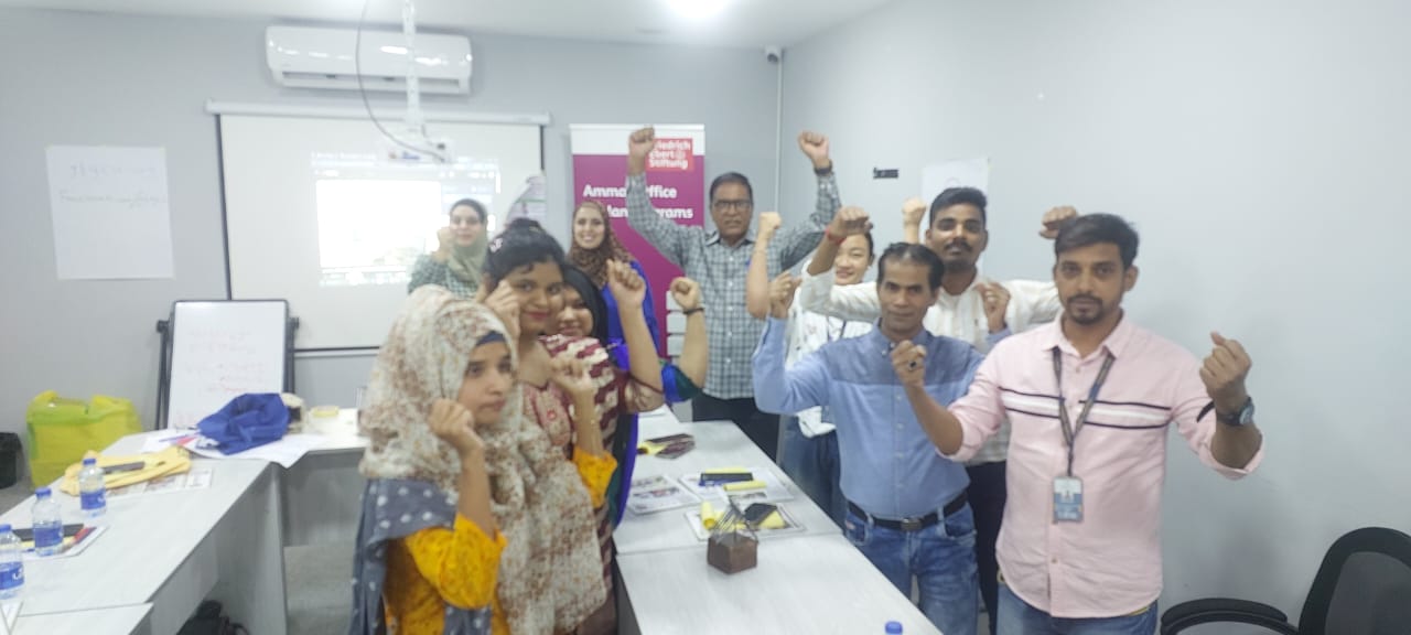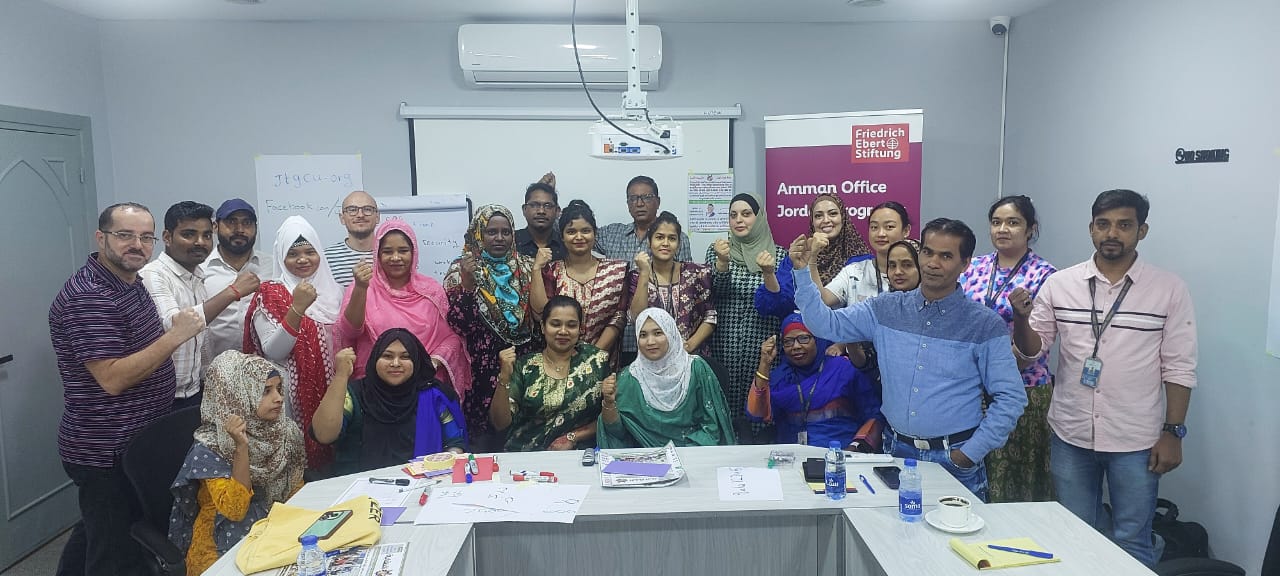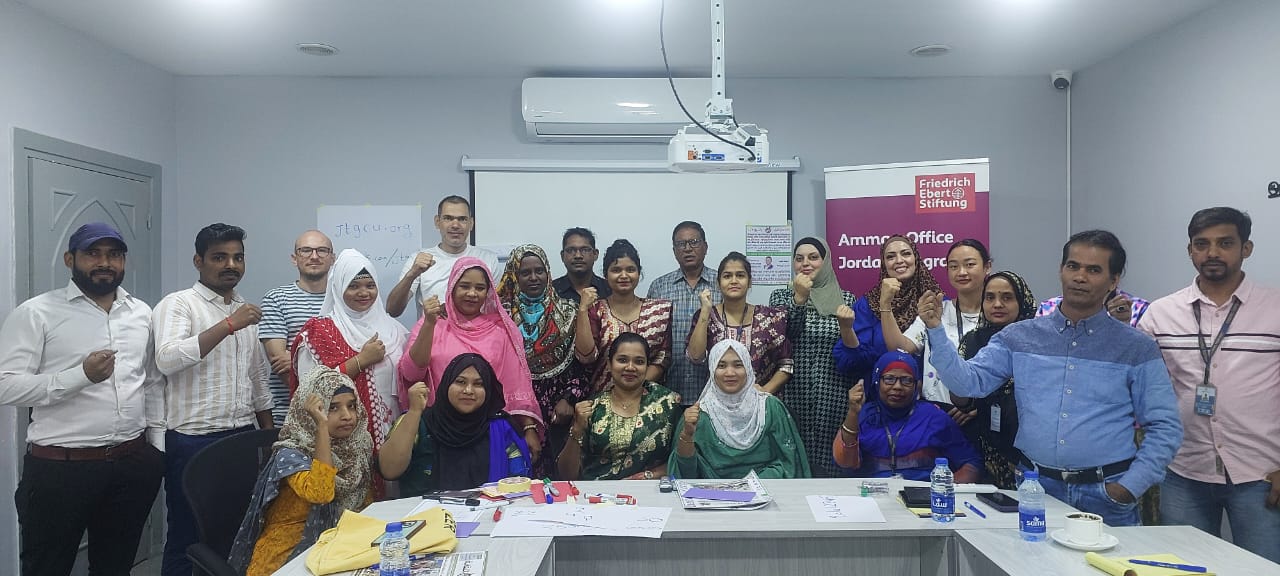 في إطار حرصها على حماية حقوق جميع العاملين؛ نظمت النقابة العامة للعاملين في صناعة الغزل والنسيج والألبسة بالتعاون مع مؤسسة فريدريش ايبرت الالمانية ورشة عمل في محافظة الكرك موجهة للعمال الوافدين في مصانع الكرك والطفيلة، بحضور ممثلتي النقابة في الطفيلة الزميلة منال الرواشدة وممثلة النقابة في محافظة الكرك الزميلة دينا أبو قديري، والمنسق النقابي الزميل أرشد علي خان الذي قام بترجمة التدريبات.