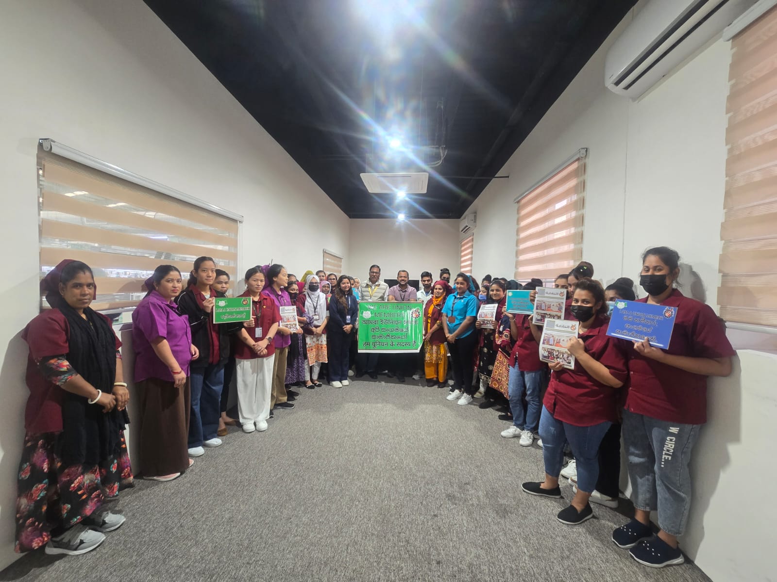 وعقدت ممثلة النقابة في التجمعات الصناعية الزميلة إيمان نصر الله اجتماعاً في مصنع الصافي، بمشاركة 85 عاملة من الجنسيات البنغالية والسريلانكية والنيبالية، جرى خلاله التعريف بدور النقابة وإنجازاتها، وقيمة الاشتراك (نصف دينار)، وامتيازات بطاقة العضوية، بما في ذلك خصومات 30% لدى مختبرات مدلاب، و50% لدى العيادة العالمية، و10% لدى بعض الصيدليات، وتم توزيع مجلة النقابة.