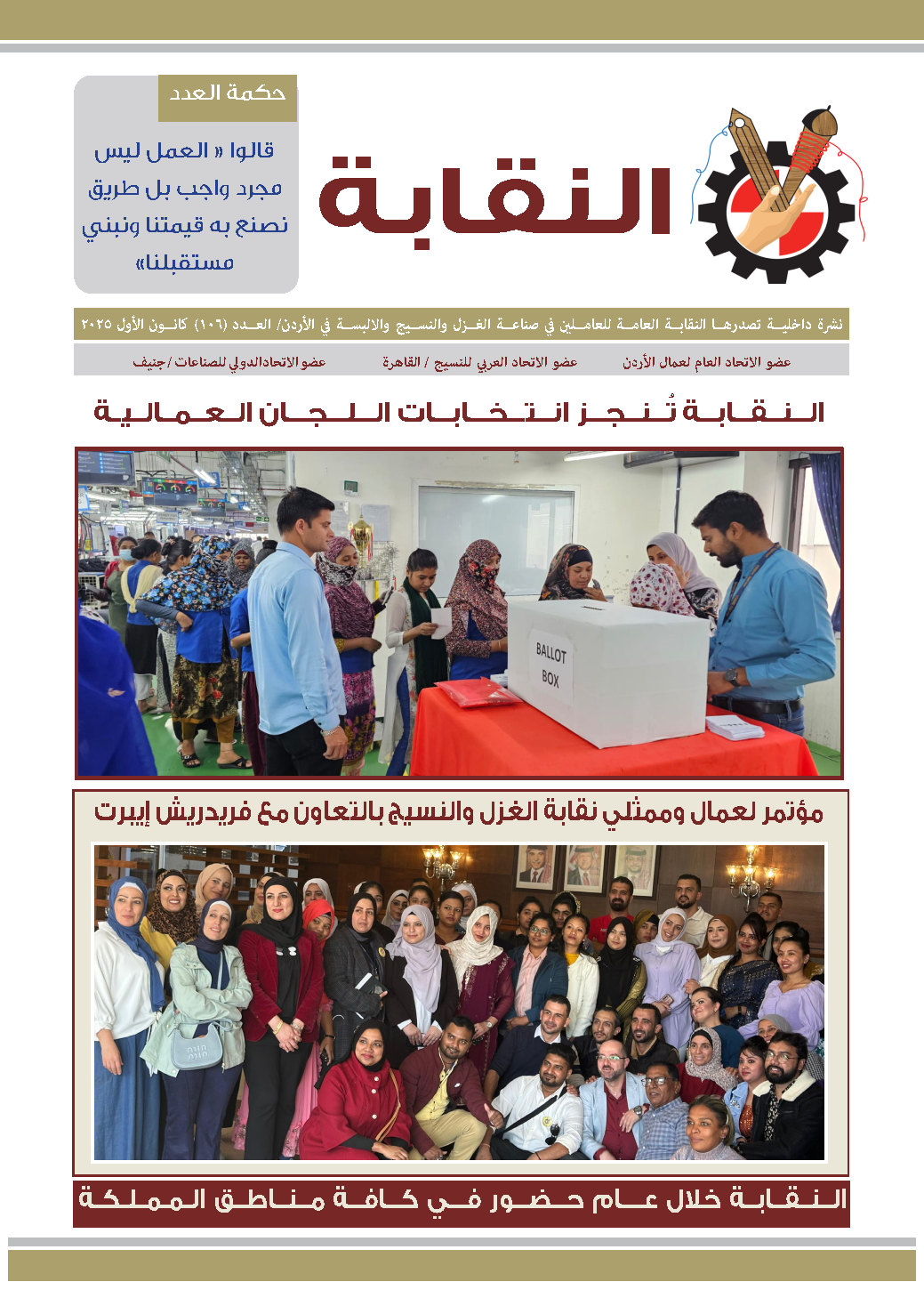 وتناول العدد ملف “النقابة في عام”، حيث استعرض أبرز الإنجازات التي حققتها النقابة على صعيد الدفاع عن حقوق العاملين، وتعزيز شروط العمل اللائق، وتوسيع قاعدة العضوية النقابية في مختلف مواقع العمل داخل المملكة.