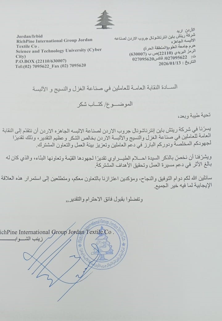 وأوضحت أن بعض المطالب نتجت عن سوء فهم لمفهوم الأجر والحد الأدنى للأجور في قطاع الألبسة، حيث قامت النقابة وبالتعاون مع وزارة العمل بتوضيح هذه المفاهيم، ما أسهم في عودة جميع العمال إلى أعمالهم، وقد وجّهت الشركة كتاب شكر للنقابة ولممثلتها في الشمال الزميلة أحلام الطيراوي والزميلة أميرة، تقديرًا لدورهما في إنهاء الاعتصام.