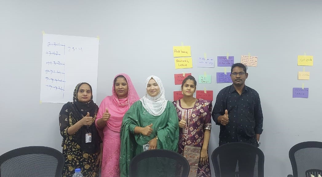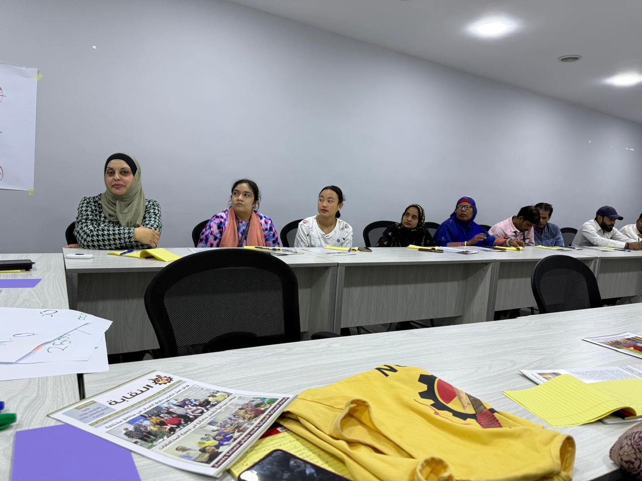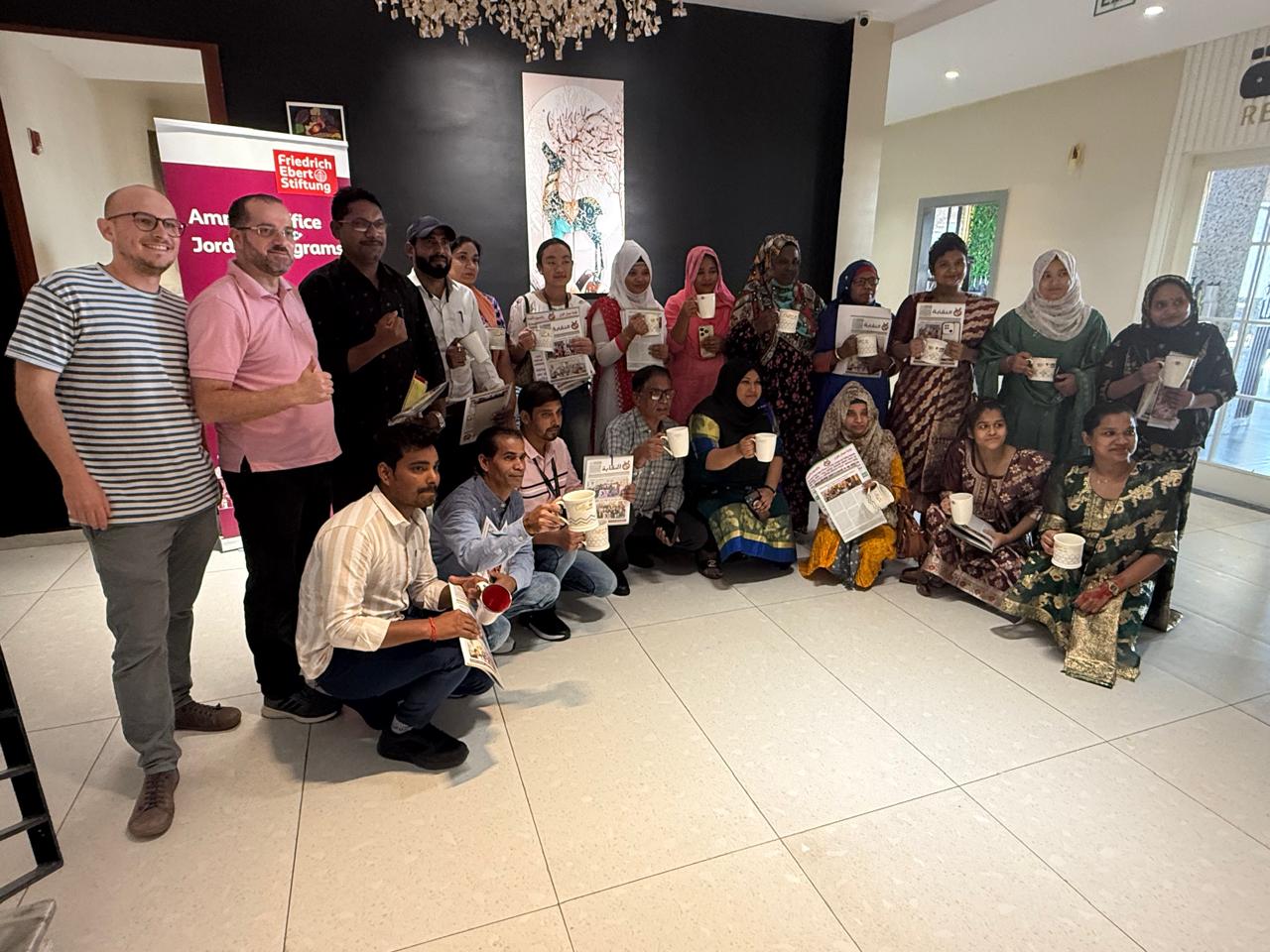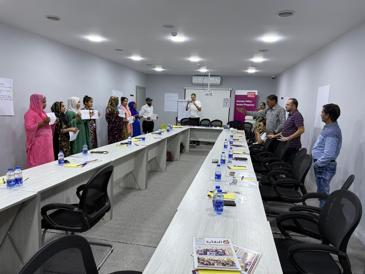 في إطار حرصها على حماية حقوق جميع العاملين؛ نظمت النقابة العامة للعاملين في صناعة الغزل والنسيج والألبسة بالتعاون مع مؤسسة فريدريش ايبرت الالمانية ورشة عمل في محافظة الكرك موجهة للعمال الوافدين في مصانع الكرك والطفيلة، بحضور ممثلتي النقابة في الطفيلة الزميلة منال الرواشدة وممثلة النقابة في محافظة الكرك الزميلة دينا أبو قديري، والمنسق النقابي الزميل أرشد علي خان الذي قام بترجمة التدريبات.